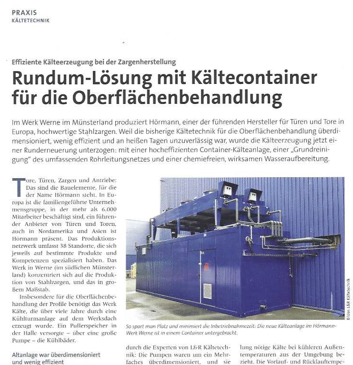 Platzsparend. Die neue Kälteanlage im Hörmann-Werk Werne ist in einem Container untergebracht. (C) den vollständigen Beitrag finden Sie in der Fachzeitschrift „KI Kälte Klimatechnik Luft (Ausgabe 11-12/2023)