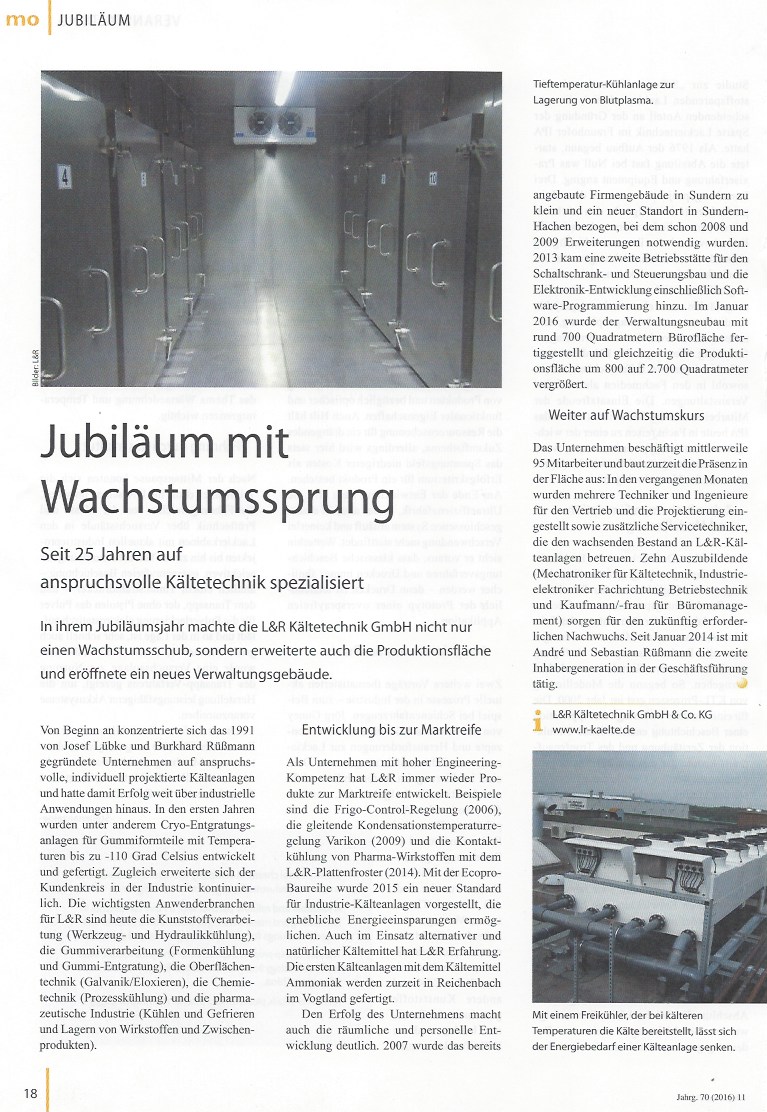 Seit 25 Jahren auf anspruchsvolle Kältetechnik spezialisiert. L&R Kältetechnik im Jubiläumsjahr: Wachstumsschub, erweiterte Produktionsfläche, neues Verwaltungsgebäude (C) dieser Beitrag wurde von der „mo Magazin für Oberflächentechnik“ in Ausgabe 11-2016 publiziert.