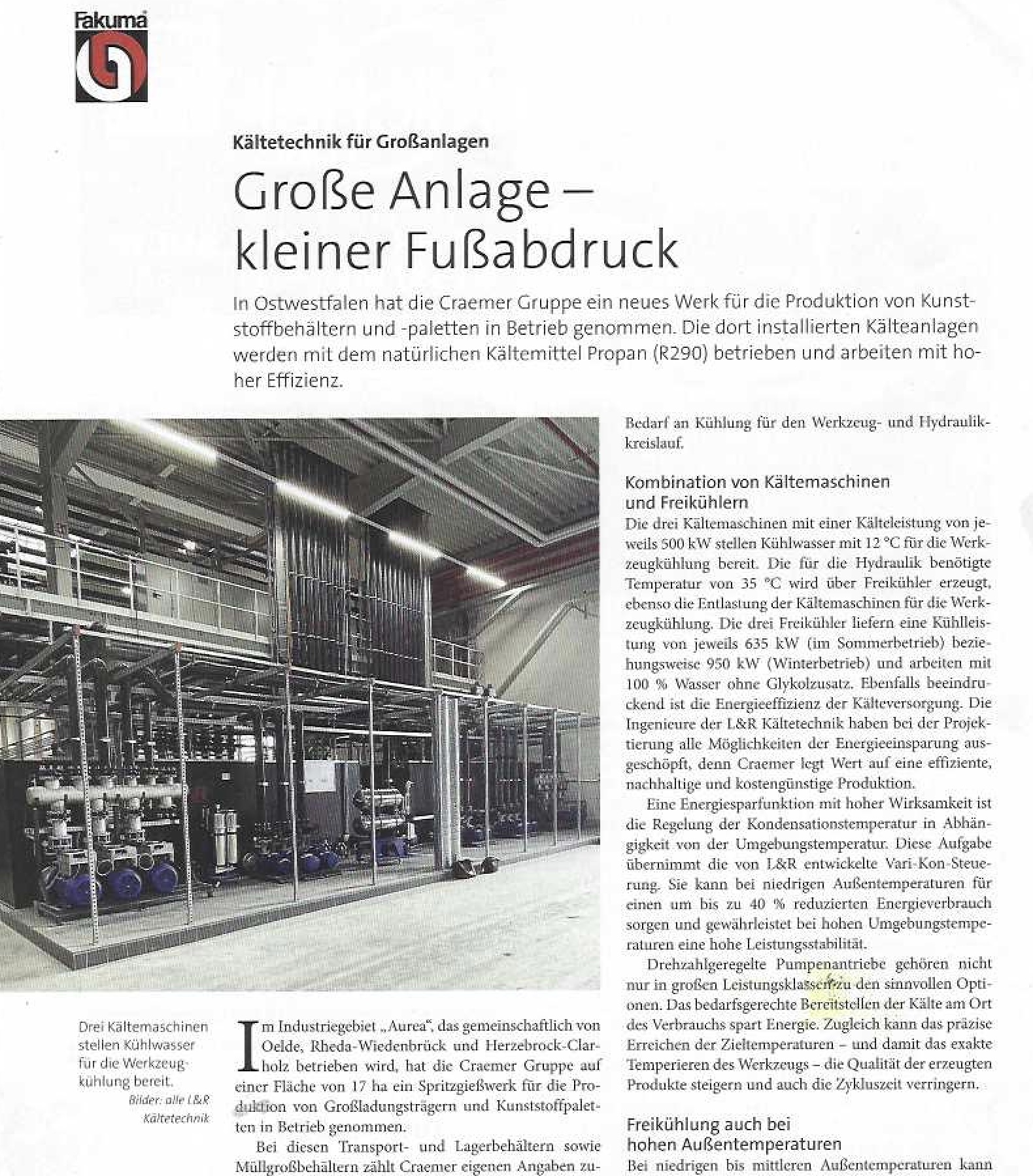 In Ostwestfalen hat die Craemer Gruppe ein neues Werk für die Produktion von Kunststoffbehältern in Betrieb genommen. Die dort installierten Kälteanlagen von L&R Kältetechnik werden mit dem natürlichen Kältemittel Propan (R290) betrieben und arbeiten hoher Effizienz. (C) den vollständigen Beitrag finden Sie im PLASTVERARBEITER, Ausgabe 10-2023.