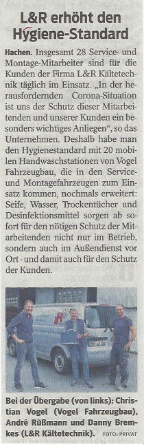L&R Kältetechnik erweitert Hygienestandard. 20 mobile Handwaschstationen wurden in den Servicefahrzeugen installiert. (C) Westfälische Rundschau 23.06.2020